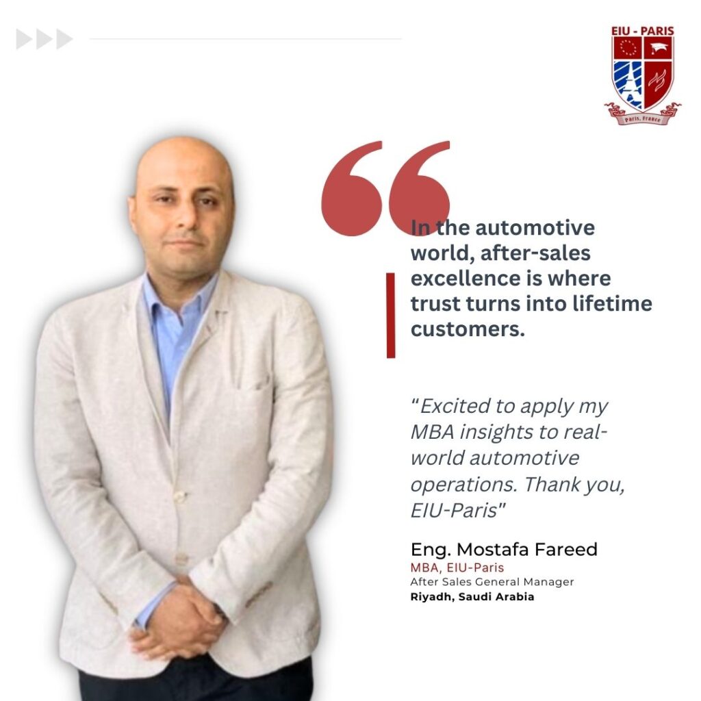 Eng. Mostafa Fareed exemplifies how professional excellence, global experience, and high-quality education come together to create impactful leadership. His MBA from EIU-Paris played a pivotal role in shaping his strategic capabilities and advancing his career across global automotive brands.